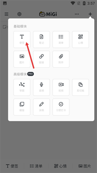 2、點擊【+】按鈕后會彈出功能模塊選擇界面,可在【基礎(chǔ)模塊】選【便簽】創(chuàng)簡單記錄。