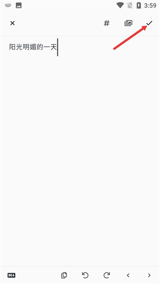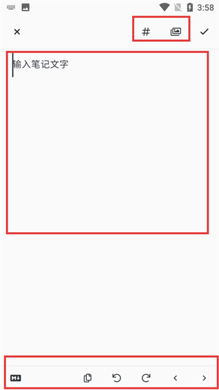 3、進(jìn)入【便簽】編輯界面后,可在【輸入筆記文字】區(qū)域填內(nèi)容,頂部【#】加標(biāo)簽、【圖片】按鈕插圖片,底部有編輯輔助工具。