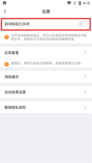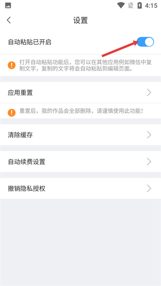 3、在【設(shè)置】界面,看到【自動(dòng)粘貼已開啟】功能,點(diǎn)擊【自動(dòng)粘貼已開啟】的開關(guān),可以將該功能關(guān)閉。