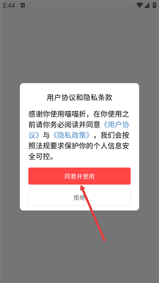 1、打開喵喵折APP后,閱讀《用戶協(xié)議和隱私條款》,點擊【同意并使用】按鈕進入應用主界面。