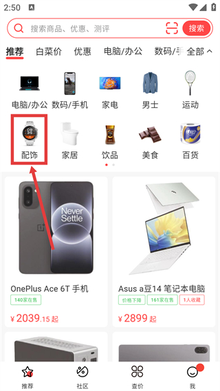 2、在主界面的分類欄中,選擇【配飾】分類,進入配飾類商品的展示頁面。