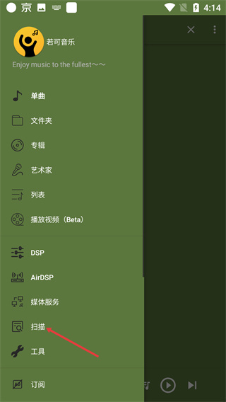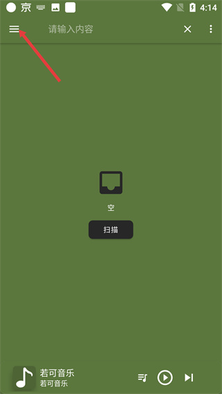 1、點(diǎn)擊左上角菜單按鈕,界面含【掃描】功能入口,底部顯示當(dāng)前播放的【若可音樂(lè)】,可展開(kāi)包含多類(lèi)功能的菜單。