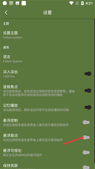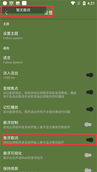 3、在設(shè)置界面可配置【主題】、【語言】等基礎(chǔ)項,【懸浮歌詞】功能當(dāng)前關(guān)閉,該功能用于懸浮顯示歌詞組件。
