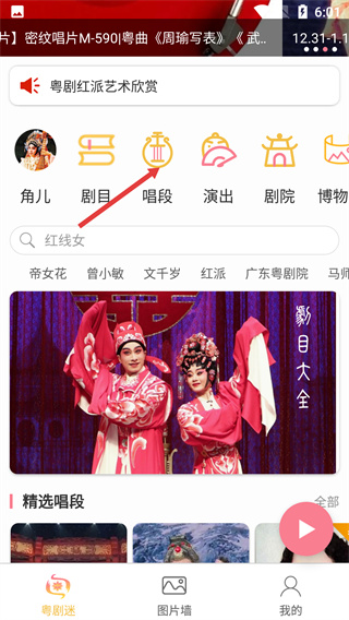 1、在粵劇迷頁面點(diǎn)擊【唱段】選項(xiàng),進(jìn)入精選唱段頁面,可查看各類粵劇唱段相關(guān)資源。