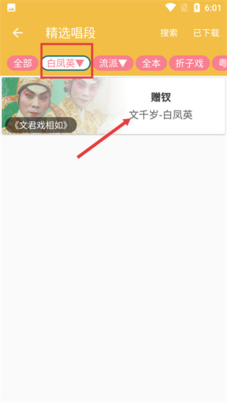 3、在藝術(shù)家列表中選擇【白鳳英】,頁面展示其對(duì)應(yīng)的《贈(zèng)釵》唱段,該唱段出自《文君戲相如》。
