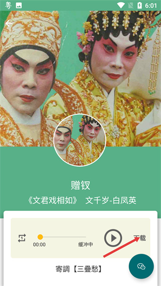 4、進(jìn)入《贈(zèng)釵》的播放頁面,點(diǎn)擊界面中的【下載】按鈕,即可將該粵劇唱段下載至本地。