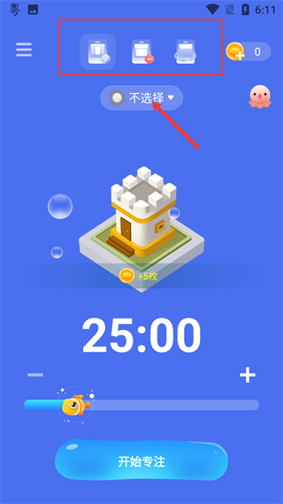 1、在APP頂部可以切換各種不同的模式,點(diǎn)擊界面中的“不選擇”下拉按鈕,展開(kāi)專注場(chǎng)景的標(biāo)簽選項(xiàng)列表,可挑選對(duì)應(yīng)場(chǎng)景標(biāo)簽以匹配專注需求。