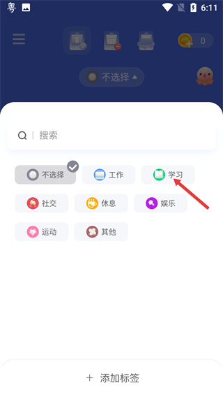 2、在標(biāo)簽列表中選擇“學(xué)習(xí)”標(biāo)簽,確定專注場(chǎng)景后,建筑樣式會(huì)適配場(chǎng)景變化,同時(shí)計(jì)時(shí)時(shí)長(zhǎng)也將對(duì)應(yīng)調(diào)整。