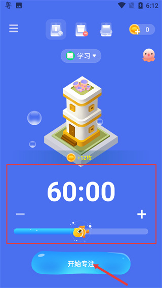 3、選定“學(xué)習(xí)”場(chǎng)景后,將計(jì)時(shí)時(shí)長(zhǎng)調(diào)整為60:00,點(diǎn)擊“開(kāi)始專注”按鈕,即可啟動(dòng)專注計(jì)時(shí)流程。