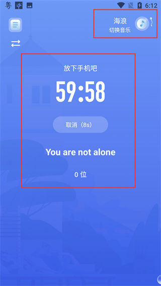 4、進(jìn)入專注計(jì)時(shí)頁(yè)面,可見(jiàn)倒計(jì)時(shí)進(jìn)度,點(diǎn)擊右上角“切換音樂(lè)”功能,可更換專注時(shí)的背景音效以輔助專注。