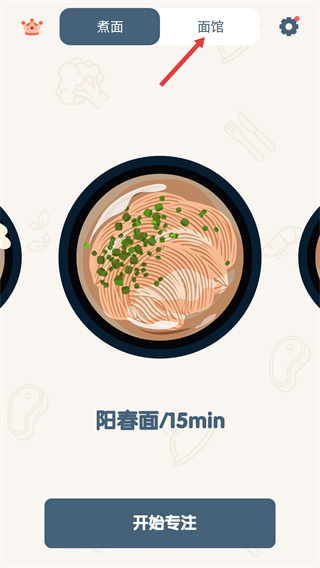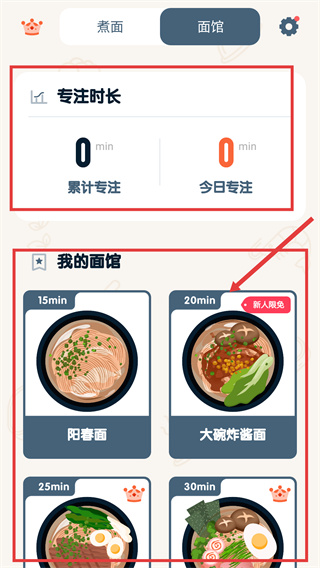 1、在煮面界面點(diǎn)擊“面館”選項(xiàng),切換至面館頁(yè)面,可查看專(zhuān)注時(shí)長(zhǎng)統(tǒng)計(jì)模塊與各類(lèi)對(duì)應(yīng)時(shí)長(zhǎng)的面食選項(xiàng)。