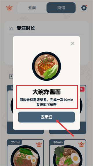 3、點(diǎn)擊“大碗炸醬面”彈出提示,說(shuō)明需完成20min專(zhuān)注獲取該面食,點(diǎn)擊“去烹飪”啟動(dòng)對(duì)應(yīng)專(zhuān)注計(jì)時(shí)。
