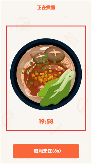 4、進(jìn)入“正在煮面”頁(yè)面,顯示大碗炸醬面的專(zhuān)注計(jì)時(shí)(剩余19:58),等待計(jì)時(shí)結(jié)束即可獲得該面食。