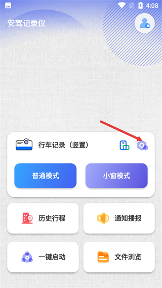 1、進入安駕記錄儀主界面,找到【行車記錄(豎置)】模塊旁的設置圖標,點擊可進入行車記錄儀設置頁面,開啟功能配置。
