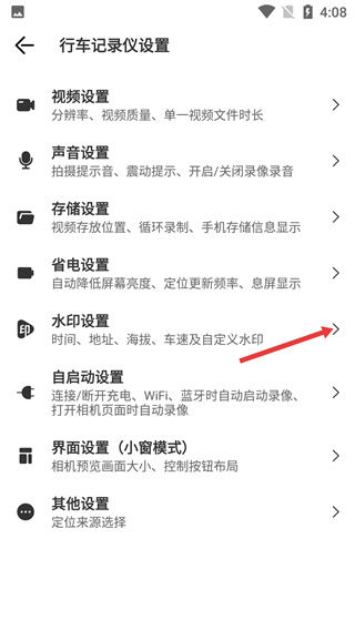 2、進入行車記錄儀設置頁面,找到【水印設置】選項,其可配置時間、地址等信息,點擊進入對應的水印配置界面。