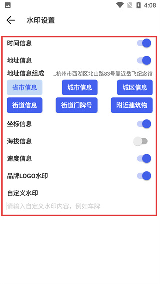 3、進入水印設置界面,可以看到【時間信息】、【地址信息】等開關,并選擇地址信息的組成維度,自定義水印內容。