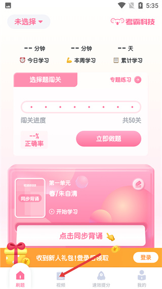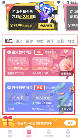 1、進(jìn)入刷題頁面后,點(diǎn)擊底部的“視頻”選項(xiàng),切換至視頻學(xué)習(xí)板塊,可查看各學(xué)科的同步學(xué)習(xí)課程內(nèi)容。