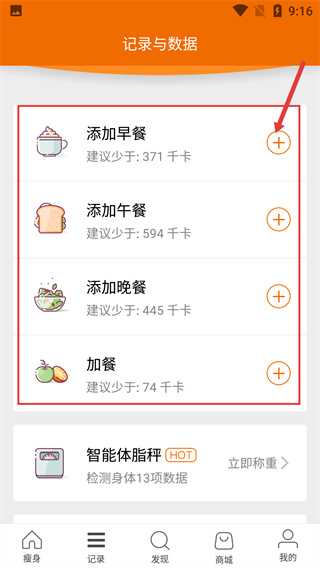 1、在【記錄與數(shù)據(jù)】頁面,點(diǎn)擊【添加早餐】右側(cè)的+號(hào),進(jìn)入早餐記錄界面,可記錄熱量符合建議的餐食。