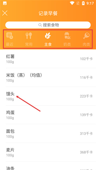 2、進(jìn)入【記錄早餐】頁面,選擇分類下的食物,可查看該食物對(duì)應(yīng)的熱量信息。