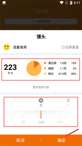 3、選擇【饅頭】后,查看其營養(yǎng)成分?jǐn)?shù)據(jù),調(diào)節(jié)重量至目標(biāo)值,點(diǎn)擊【確定】完成該食物的記錄配置。