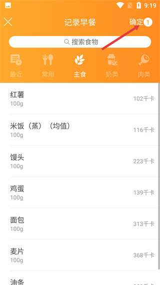 4、選好所有食物后,點(diǎn)擊頁面右上角的【確定】按鈕,即可完成本次早餐餐食的記錄操作。