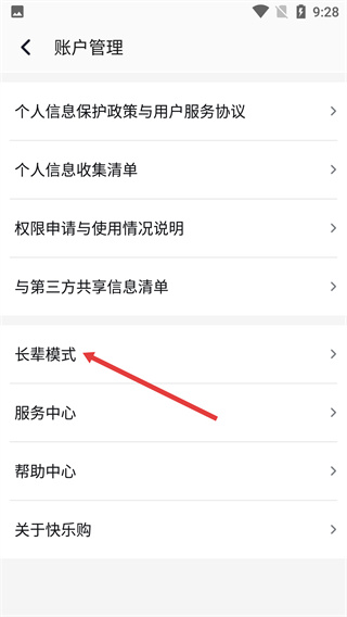 2、在【賬戶管理】頁面中,找到并點擊【長輩模式】選項,進入該模式的功能介紹頁面。