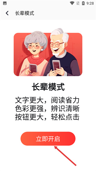 3、在【長輩模式】介紹頁,可了解其“文字更大、辨識清晰”等特點,點擊【立即開啟】按鈕觸發(fā)生效提示。