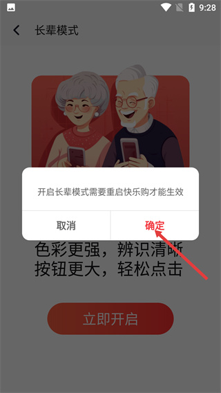 4、彈出“開啟長輩模式需要重啟快樂購才能生效”的提示后,點擊【確定】按鈕重啟軟件,使該模式生效。