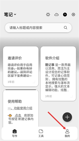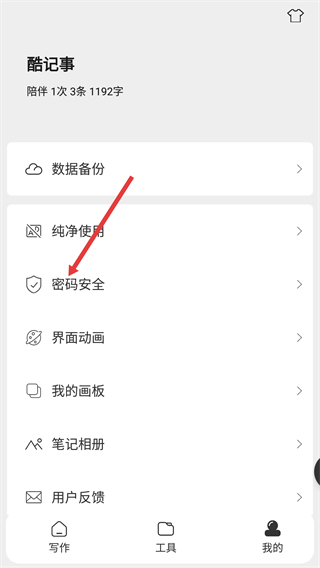 2、在酷記事主界面,點(diǎn)擊底部導(dǎo)航欄的【我的】選項(xiàng),進(jìn)入包含密碼安全等功能的個(gè)人中心頁(yè)面。