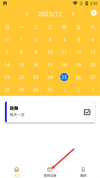 1、進(jìn)入日歷界面,點(diǎn)擊底部【簽到記錄】按鈕查看打卡詳情。