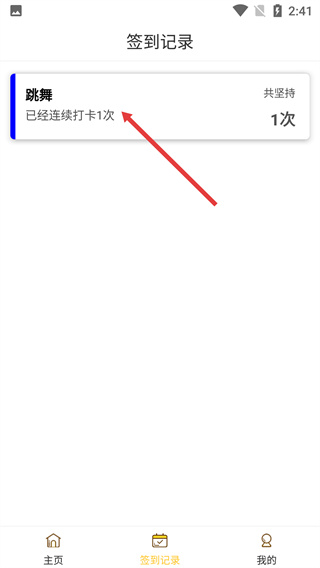 2、進(jìn)入簽到記錄頁面,查看【跳舞】項(xiàng)目的【已經(jīng)連續(xù)打卡1次】、【共堅(jiān)持1次】的打卡數(shù)據(jù)信息。