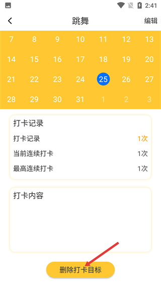 3、進(jìn)入打卡詳情頁,點(diǎn)擊【刪除打卡目標(biāo)】按鈕發(fā)起移除操作。