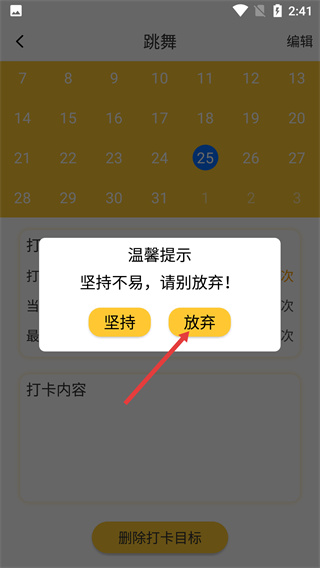 4、點(diǎn)擊刪除后彈出【溫馨提示】,顯示“堅(jiān)持不易,請(qǐng)別放棄!”,選擇【放棄】按鈕確認(rèn)刪除該打卡目標(biāo)。