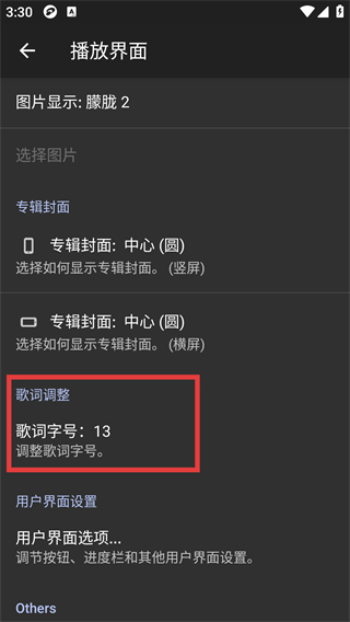 4、在播放界面設(shè)置頁(yè),可調(diào)整【歌詞調(diào)整-歌詞字號(hào):13】,還能設(shè)置【專輯封面】等顯示選項(xiàng),自定義播放界面展示效果。