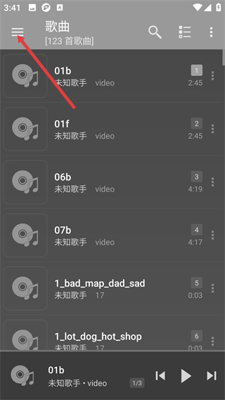1、在歌曲列表頁面,點擊左上角的菜單按鈕,展開應(yīng)用的側(cè)邊功能欄。