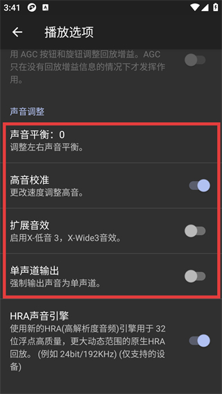 4、在播放選項界面,可調(diào)整聲音平衡、高音效、擴(kuò)展音效、單聲道輸出等聲音相關(guān)參數(shù)。
