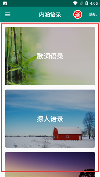 1、進(jìn)入“內(nèi)涵語(yǔ)錄”頁(yè)面,可查看【歌詞語(yǔ)錄】、【撩人語(yǔ)錄】等分類板塊,瀏覽不同類型的語(yǔ)錄內(nèi)容。