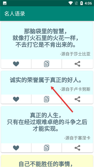 3、在名人語(yǔ)錄列表頁(yè),可查看多條帶出處的名人語(yǔ)錄,每條語(yǔ)錄下方設(shè)有收藏、復(fù)制、分享功能按鈕,可對(duì)目標(biāo)語(yǔ)錄進(jìn)行操作。