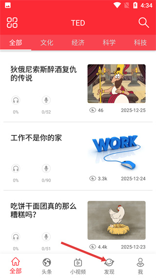 1、在TED內(nèi)容列表頁,點擊底部導(dǎo)航欄的【發(fā)現(xiàn)】按鈕,進(jìn)入功能拓展的發(fā)現(xiàn)頁面。
