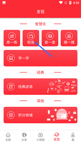 2、進(jìn)入發(fā)現(xiàn)頁面后,找到“智慧化”板塊下的【配音】功能按鈕并點擊,進(jìn)入配音內(nèi)容的列表頁面。