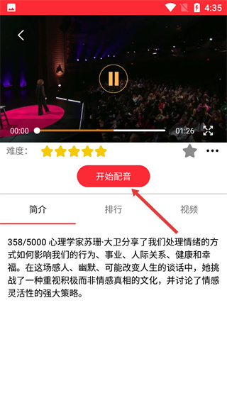 4、在配音詳情頁,查看內(nèi)容簡介與難度信息后,點擊【開始配音】按鈕,啟動該內(nèi)容的配音練習(xí)流程。