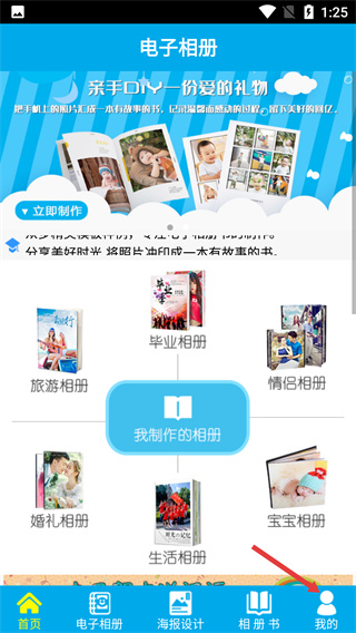 1、在電子相冊(cè)頁(yè)面,點(diǎn)擊底部導(dǎo)航欄的“我的”按鈕,進(jìn)入包含個(gè)人信息與各類定制內(nèi)容的個(gè)人中心頁(yè)面。