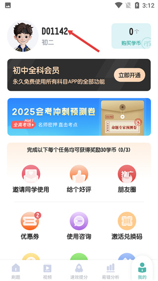 1、在刷題頁面,點(diǎn)擊底部導(dǎo)航欄的【我的】按鈕,進(jìn)入包含會員、任務(wù)等功能的個(gè)人中心頁面。