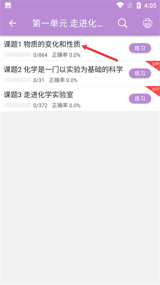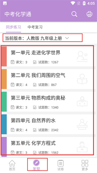 1、在“中考化學(xué)通”的發(fā)現(xiàn)頁(yè)面,確認(rèn)當(dāng)前教材版本后,選擇目標(biāo)單元,進(jìn)入該單元的課題列表頁(yè)面。