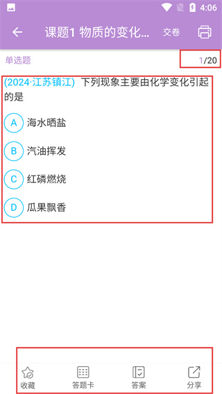 4、進(jìn)入習(xí)題頁(yè)面后,即可完成對(duì)應(yīng)知識(shí)點(diǎn)的題目練習(xí),同時(shí)可借助收藏、答題卡等功能輔助練習(xí)過(guò)程。