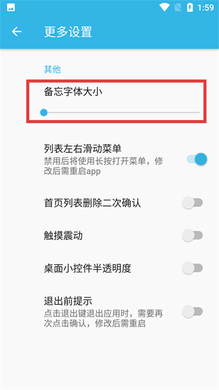 4、在【更多設置】頁面,找到【備忘錄字體大小】的滑塊,拖動滑塊即可調(diào)整備忘錄內(nèi)容的字體顯示大小。