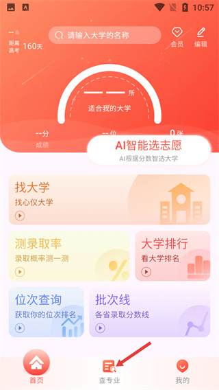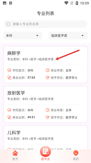 1、進(jìn)入APP首頁(yè),點(diǎn)擊底部導(dǎo)航欄的【查專(zhuān)業(yè)】按鈕,可進(jìn)入專(zhuān)業(yè)列表頁(yè)面,開(kāi)展專(zhuān)業(yè)相關(guān)查詢(xún)操作。