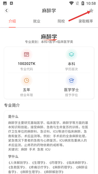 4、進(jìn)入專(zhuān)業(yè)詳情頁(yè),可查看該專(zhuān)業(yè)的代碼、修業(yè)年限、授予學(xué)位及專(zhuān)業(yè)簡(jiǎn)介等詳細(xì)信息,點(diǎn)擊收藏按鈕完成專(zhuān)業(yè)收藏操作。