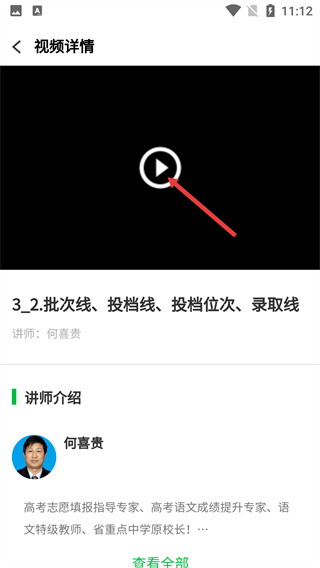 4、進(jìn)入視頻詳情頁后,點(diǎn)擊頁面中的播放按鈕,即可觀看該專家講座視頻,獲取志愿填報(bào)相關(guān)知識(shí)。