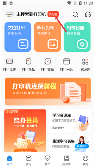 1、進(jìn)入APP首頁,看到“未搜索到打印機(jī)”提示,點擊右側(cè)的【去配置】按鈕,啟動打印機(jī)配置流程。